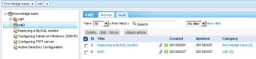 Move - Moves selected articles to a different position in the knowledge base tree. This does not affect explicit links between articles and categories.