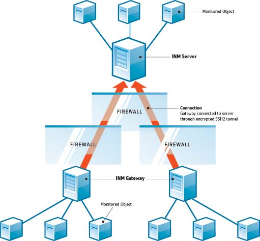 Network Monitor supports the monitoring of servers, routers and other types of assets on multiple networks. A gateway is installed on the server's local network and each remote network managed by Network Monitor. Assets are monitored by the gateway sharing their same network. Each gateway, local and remote, sends its monitoring results back to the Network Monitor server.