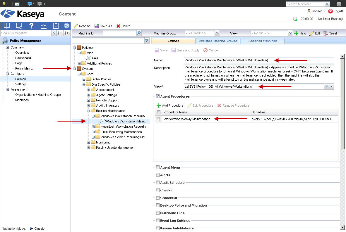 For example, in the image below we see details of a System cabinet policy called Windows Workstation Maintenance (Weekly M-F 6pm-6am).