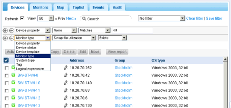 Group and gateway list views can be filtered by multiple conditions. Types of filters include: