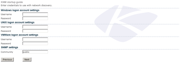 Network discovery is automatically performed on the local network immediately after the install. Enter a set of credentials that matches the devices on the server's local network. Credentials can always be added after the install and network discovery run again.