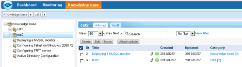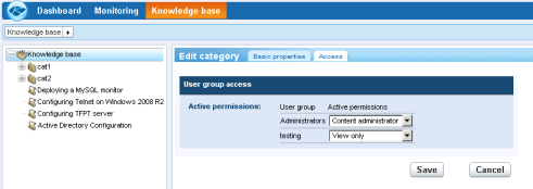 User rights to view or modify an article are set by category and are optionally inherited from higher level categories in the knowledge base tree.