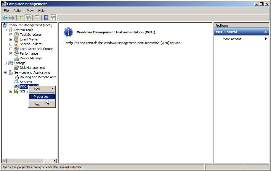 Open Administrative tools > Computer management, right click "WMI Control" to select the "Properties" option.