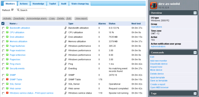 Network Monitor monitors assets. An asset represents a computer or any other type of network device that can be accessed by an IP number or host name. Each asset managed by Network Monitor displays as a separate node in the monitor tree. The parent node of an asset is either a gateway or a group. A selected asset node provides a list view of all the monitors assigned to that asset.