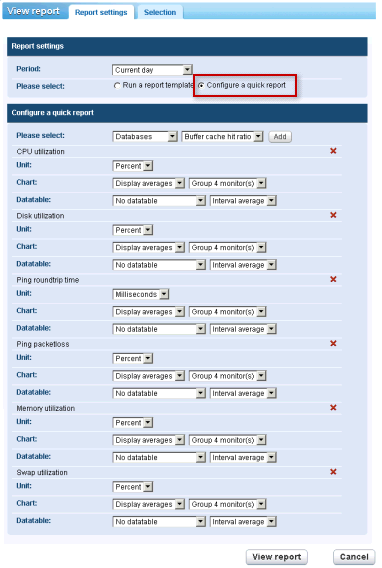Click the Configure a quick report option. The Report settings tab lists a series of configuration sections, one or more for each type of monitor you selected earlier.