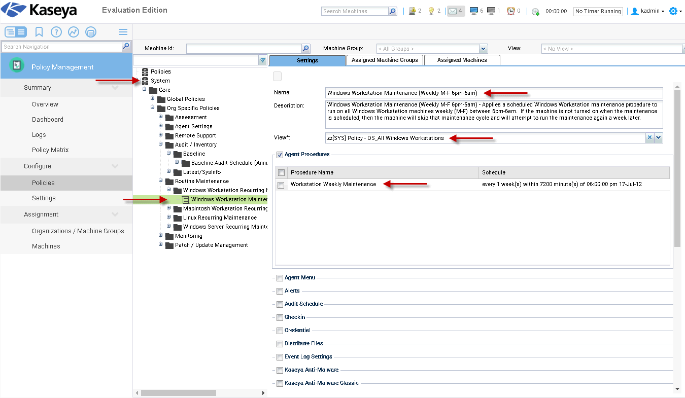 For example, in the image below we see details of a System cabinet policy called Windows Workstation Maintenance (Weekly M-F 6pm-6am).