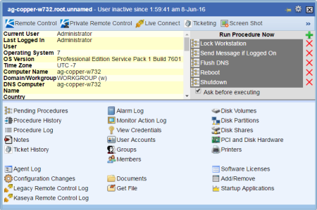 Hovering the cursor over a check-in icon displays an agent Quick View window immediately. You can use this window to view agent properties, start a shared or private Kaseya Remote Control session, launch an agent procedure, or launch Live Connect.