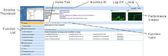 Live ConnectDie Seite Live Connect wird durch Klicken auf ein beliebiges Check-in-Symbol, wie beispielsweise Mithilfe von Live Connect können Sie Aufgaben und Funktionen für jeweils einen verwalteten Rechner ausführen. Hinweis: Beim ersten Start von Live Connect von einem Rechner aus werden Sie zum Installieren mehrerer Browser-Plugins aufgefordert. Fensterkopfzeile Oben im Fenster Live Connect werden grundlegende Informationen über den verwalteten Rechner angezeigt.