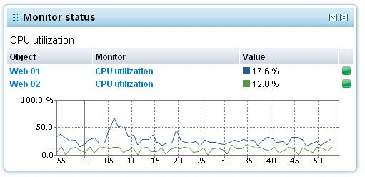 The widget displays status information for a number of selected monitors. In addition, real time statistics data for up to one hour can be shown for selected monitors. From the widget configuration select and add the desired monitors to be shown in the widget.
