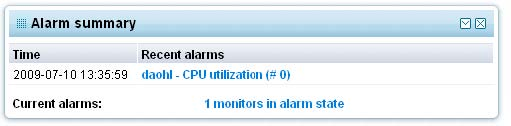 The widget displays the latest generated alarms, with time stamp and monitor information. From the widget configuration the number of alarms to be displayed can be selected.
