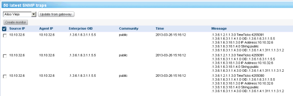 The 50 latest SNMP traps page displays the 50 latest SNMP trap messages received by each gateway. Use this page to ensure SNMP trap messages are being received by Network Monitor. SNMP trap monitors cannot respond to an SNMP trap message unless that SNMP trap message displays on this page. You can also use this page to create SNMP trap monitors for one or more assets.