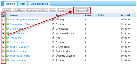 The fastest way to configure a quick report is from the list view of a Monitors tab of a single asset. Select all the monitors for that asset on the Monitors tab. Click the View report button at the top of the monitor list.