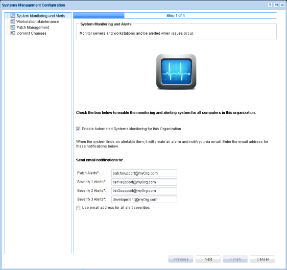 Note: To enable multiple organizations to make use of the same built-in, standard policies in Policy Management, placeholder tokens are entered in policy fields requiring an email address. These token values are #patchAlertEmail#, #sev1AlertEmail#, #sev2AlertEmail#, and #sev3AlertEmail#. The VSA automatically replaces a token value in a policy with the appropriate email address for a specific organization when an alert notification is sent out. The organization email addresses referenced by tokens are specified using this wizard page. The Policy Management policy categories that include email addresses are Alerts, Monitor Sets and Patch Settings.