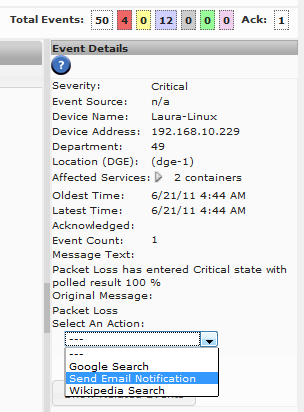 In addition to automatically invoking actions based on certain event conditions, you can configure the Event Manager to run an action on demand. This is done be selecting an event and clicking on Show Details, and then the Select an Action drop-down list lets you choose a pre-defined action to trigger, as shown.