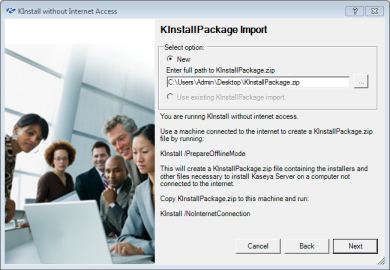 KInstallPackage.zip file will be created for you on the desktop of your internet-access machine. This zip file contains all the files required for your non-internet-access install.KInstallPackage.zip file from the internet-access machine to the non-internet-access machine.KInstall.exe again and it will display this same page again.KInstall.exe with a /nointernetaccess parameter.KInstallPackage.zip you copied from the internet-access machine.