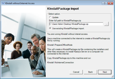 KInstallPackage.zip has already been installed at least once. Select one of two options.KInstallPackage.zip. Click the browse [...] button to locate the KInstallPackage.zip you copied from the internet-access machine.KInstallPackage.zip you already installed.